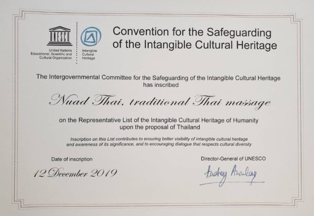 - To promote and preserve Thai massage, following the inclusion of “Nuad Thai (Thai Massage)” in UNESCO’s Intangible Cultural Heritage list on December 12, 2019 (Convention for the Safeguarding of the Intangible Cultural Heritage).